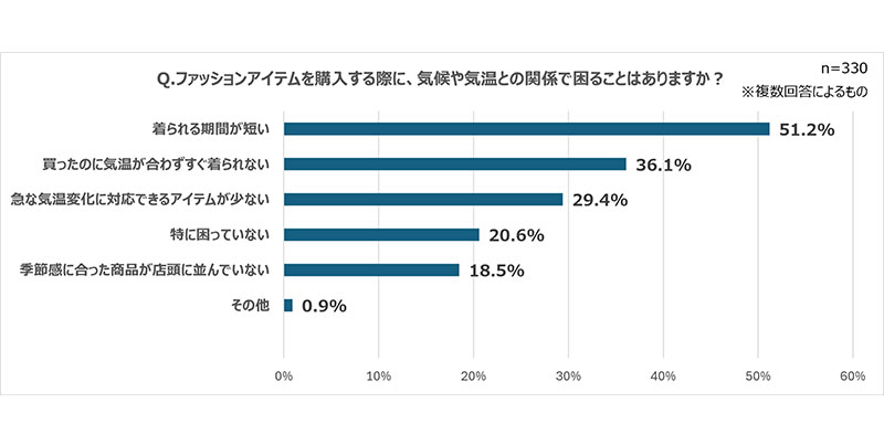 続いて「ファッションアイテムを購入する際に、気候や気温との関係で困ることはありますか?」と質問。「着られる期間が短い」(51.2%)、「買ったのに気温が合わずすぐ着られない」(36.1%)、「急な気温変化に対応できるアイテムが少ない」(29.4%)など、“気候のズレ”による季節の読みにくさから、服選びに悩む回答が目立った。