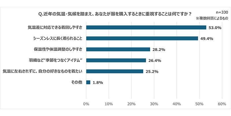 「近年の気温・気候をふまえ、あなたが服を購入するときに重視すること」をたずねたところ、最も多かったのは「気温差に対応できる着回しやすさ」(53.0%)で、次いで「シーズンレスに長く着られること」(49.4%)が上位に入った。
