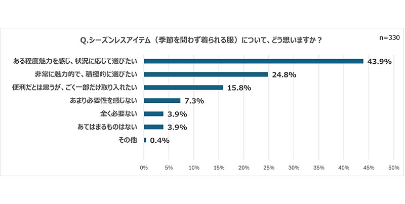 「シーズンレスアイテム(季節を問わず着られる服)について、どう思いますか?」という設問に対する回答は「ある程度魅力を感じ、状況に応じて選びたい」(43.9%)、「非常に魅力的で積極的に選びたい」(24.8%)という結果に。約7割がシーズンレスアイテムに興味を持っていることが、明らかとなった。
