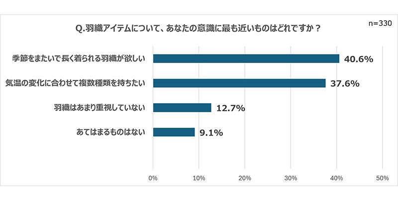 「羽織りアイテムについて、あなたの意識に最も近いものはどれですか?」という設問には「季節をまたいで長く着られるものが欲しい」(40.6%)や「気温の変化に合わせて複数種類を持ちたい」(37.6%)という回答が。シーズンレスに活躍するアイテムとして、羽織りの実用性の高さを裏付ける結果となった。