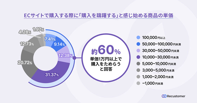 ECでのファッションアイテム購入をためらう単価として、最も多かった価格帯は「1万〜3万円未満」(31.37%)となり、約60%が1万円以上だと購入をためらうと回答した。