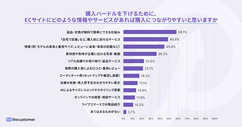 購入ハードルを下げるために求められる情報・サービスとしては、「返品・交換が無料で簡単にできる仕組み」(58.1%)や「自宅で試着など、購入前に試せるサービス」(49.9%)が上位に挙がった。