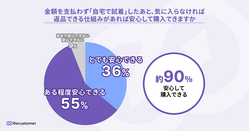 「金額を支払わずに自宅で試着し、気に入らなければ返品できる仕組みがあれば安心して購入できるか」という質問に対しては「とても安心できる」(36%)、「ある程度安心できる」(55%)と、合わせて約90%が肯定的に回答した。