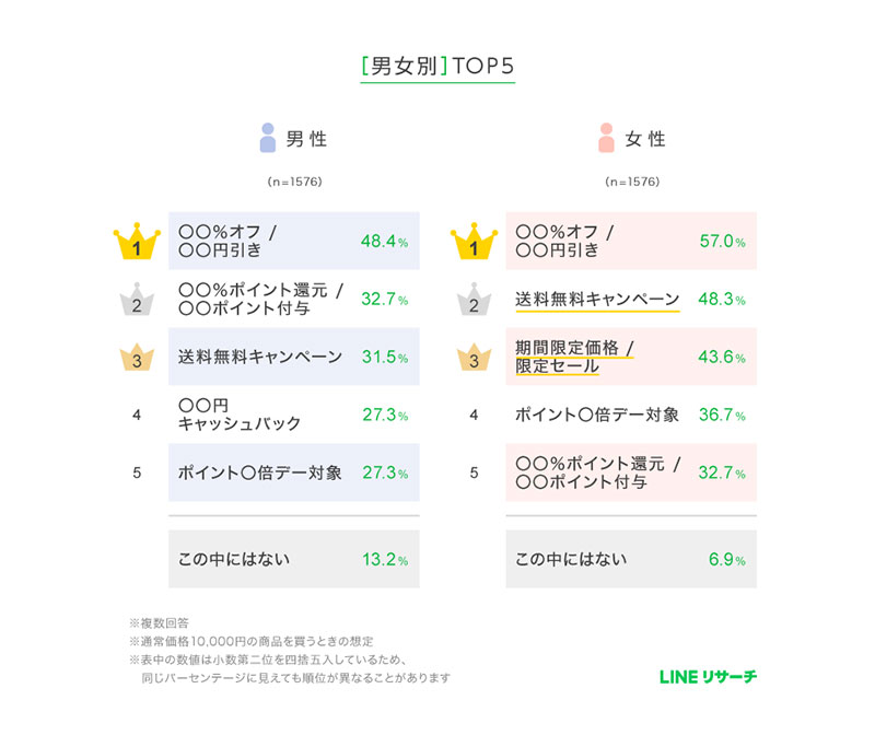 男女別では「期間限定価格/限定セール」「送料無料キャンペーン」が、女性のほうが男性よりも高い割合に。「ポイント〇倍デー対象」「〇〇%オフ/〇〇円引き」も女性のほうが、やや高くなった。