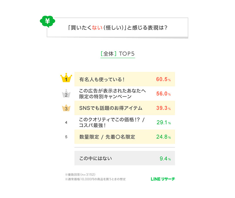 前項と同じ選択肢で、通常価格が1万円の商品を買うときに「買いたくない(怪しい)」と感じる表現を質問。全体では「有名人も使っている!」が、6割強で1位になった。