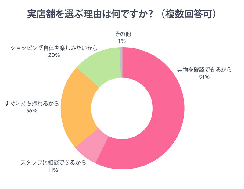 「実店舗が多い」「どちらも同じくらい」と回答した計75%に対して、実店舗を選ぶ理由についてヒアリング。その結果「実物を確認できるから」(91%)が、圧倒的多数を占めた。