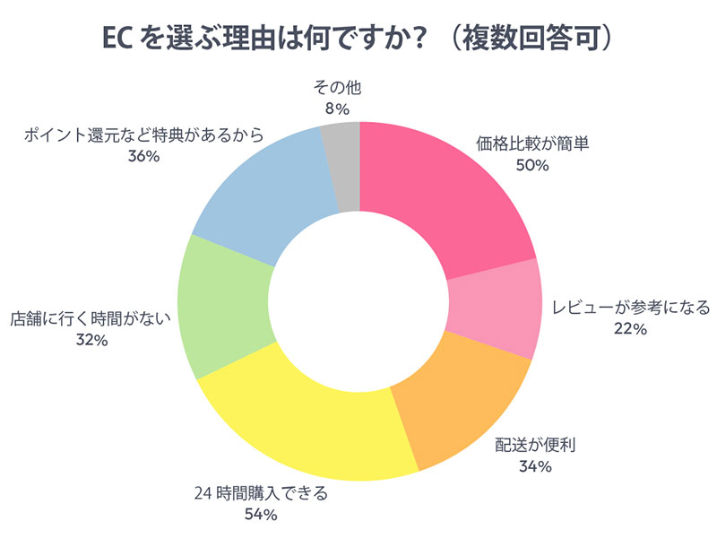 次いで「価格比較が簡単」(50%)、「ポイント還元など特典がある」(36%)と続いた。お得に購入できる「コスパ」や時間に縛られない自由さ「タイパ」が、ECの魅力となっていることがうかがえる。