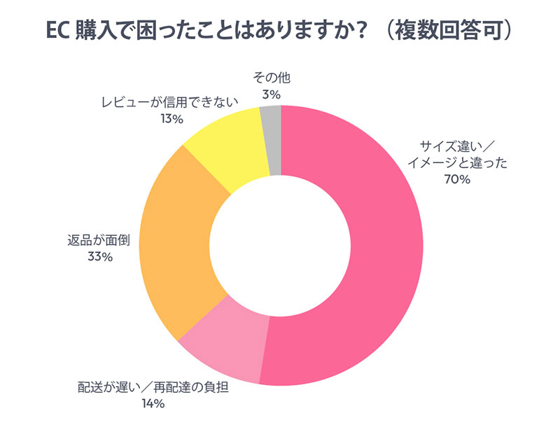 一方、EC購入で困ったこととしては「サイズやイメージの違い」(70%)、「返品の手間」(33%)など、実物を確認できないことに由来する点が挙げられている。