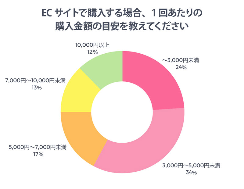 ECでの1回あたりの購入金額は「3000~5000円未満」(34%)が最も多く、「3000円未満」(24%)を合わせると、半数以上が5000円未満での利用となった。