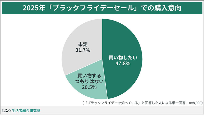 「ブラックフライデー」について、「知っている」(68.3%)「名前は知っている」(27.2%)を合わせた95.5%が認知。ブラックフライデーセールでの購入意向をたずねたところ、約半数(47.8%)が「買い物したい」と回答した。