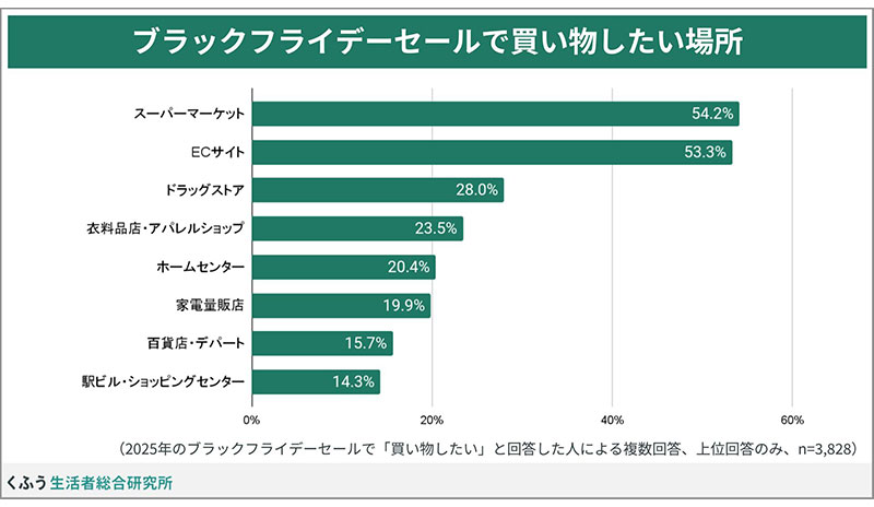 続いて、ブラックフライデーで買い物したい場所について質問したところ、「スーパーマーケット」(54.2%)が最も多く、「ECサイト」(53.3%)が僅差で続いた。