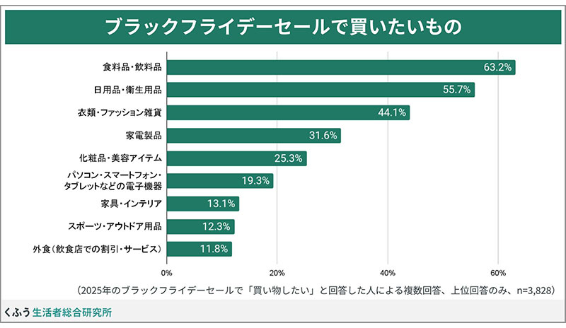 ブラックフライデーで買いたいものは「食料品・飲料品」(63.2%)が最も多く、「日用品・衛生用品」(55.7%)が続いた。