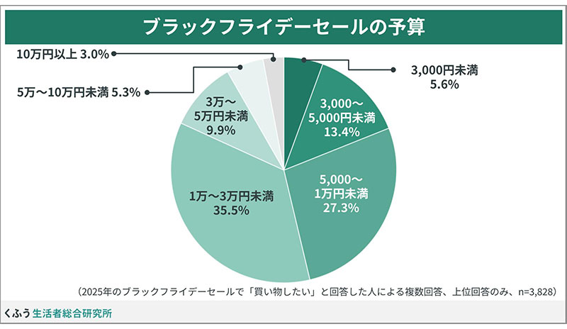 2025年のブラックフライデーセールの買い物予算は「1万~3万円未満」(35.5%)の金額帯が最も多くなり、選択肢での回答から算出した平均予算は2万2882円となった。