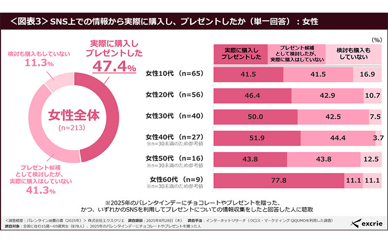 エクスクリエが実施した調査によると、2025年のバレンタインにプレゼントを贈った相手について、女性全体では配偶者へのプレゼントが48.5%で最多となった。一方、10代から20代では恋人へのプレゼントが多くなっており、10代は同性の友人へ贈った割合が他年代よりも圧倒的に高くなった。