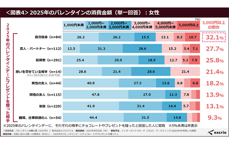【バレンタイン消費白書(2025年)】女性の約半数が配偶者にプレゼント、10代は同性友人へ贈る傾向―エクスクリエ調査
