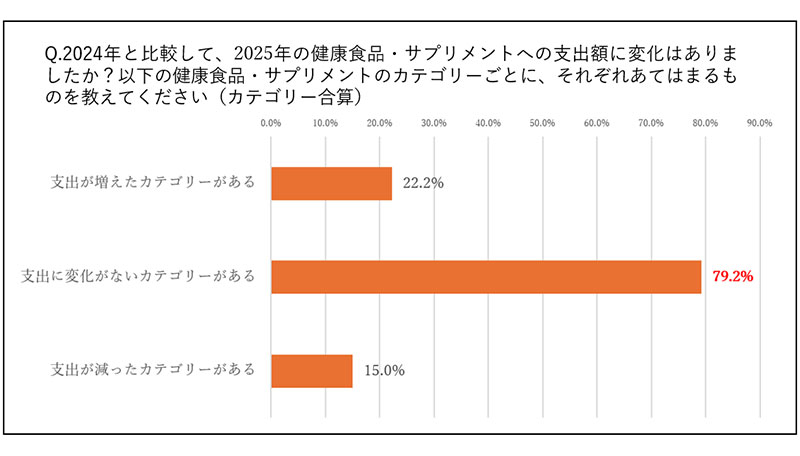 現在、健康食品・サプリメントを利用している人に2024年と比較して、2025年の健康食品・サプリメントへの支出額の変化の有無を質問。過半数が全20カテゴリー中、19カテゴリーにおいて「支出に変化がない」と回答した。