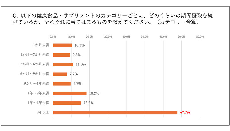 また、大半のカテゴリーで「3年以上継続利用している」と回答した人が50%以上を占めた。一度、生活に定着した健康食品は家計が厳しい状況でも購入が続けられることから、「(健康食品・サプリメントは)『必需品』と考えられている可能性が考えられる」と電通ダイレクトは分析している。