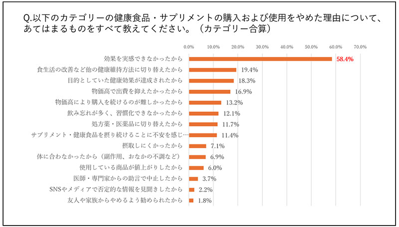 健康食品の利用を中止した理由をたずねた項目では「効果が実感できなかったから」が58.4%で最多だった。「物価高で出費を抑えたかったから(16.9%)」や「物価高により購入を続けるのが難しかったから(13.2%)」を大きく上回った。