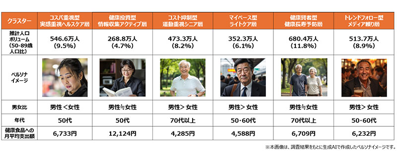電通ダイレクトは独自のクラスター分析により、健康食品を購入するシニアを6つのタイプに分類。