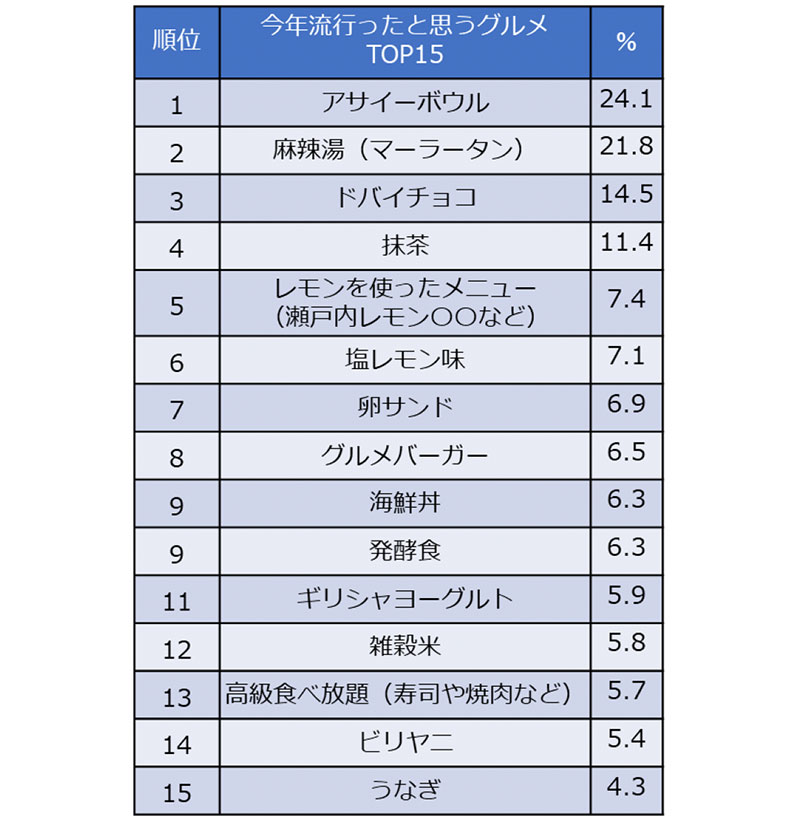 今回の調査によれば、ホットペッパーグルメ外食総研が挙げた37の選択肢の中から「今年流行ったと思うグルメ」を聞いたところ、「アサイーボウル」が24.1%でトップ。2位は「麻辣湯(21.8%)」、3位は数年来SNSで話題となっていた「ドバイチョコ(14.5%)」が入った。