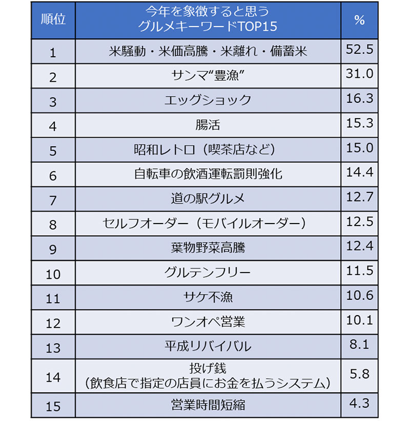 同じく、ホットペッパーグルメ外食総研が挙げた20の選択肢の中から「今年を象徴すると思うグルメキーワード」を聞いたところ、「米騒動・米価高騰・米離れ・備蓄米」が過半数を超えて1位に(52.5%)。備蓄米放出が連日ニュースになるなど、日々の生活でも米の高騰を意識している人が多いことが推測される。