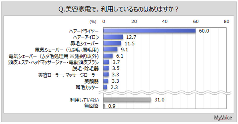 利用している美容家電は(複数回答)、「ヘアードライヤー」が60.0%、「ヘアーアイロン」「鼻毛シェーバー」が各1割強という結果に。
