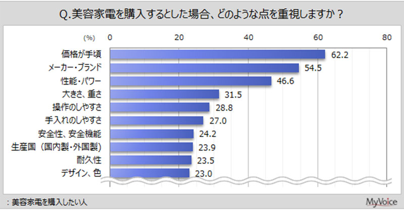 美容家電購入意向者の重視点は(複数回答)、「価格が手頃」が62.2%、「メーカー・ブランド」が54.5%、「性能・パワー」が46.6%を占めた。