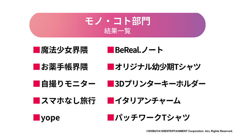 2018年より毎年発表している「SHIBUYA109 lab.トレンド予測」。around20(15~24歳)の女性の来年の流行や関心事を予測して発表してきた。SHIBUYA109 lab.が保有する独自ネットワーク「SHIBUYA109 lab. MATE」に所属する、around20の女性たちと実施した「トレンド予測会議」や毎月のSHIBUYA109渋谷店館内での調査の結果を基にノミネートを選定。その後選択式アンケートを実施して上位項目をピックアップしている。