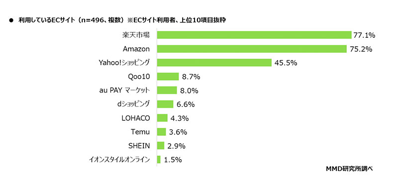 ECサイトを普段利用している496人を対象に、利用しているECサイトを質問。その結果「楽天市場」が77.1%と最多となり、「Amazon」75.2%、「Yahoo!ショッピング」45.5%と続いた。