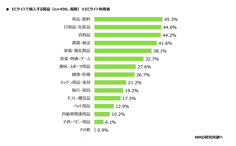 ECサイトで購入する商品は「食品・飲料」が45.3%と最も多く、次に「日用品・化粧品」が44.6%、「衣料品」が44.2%となった。