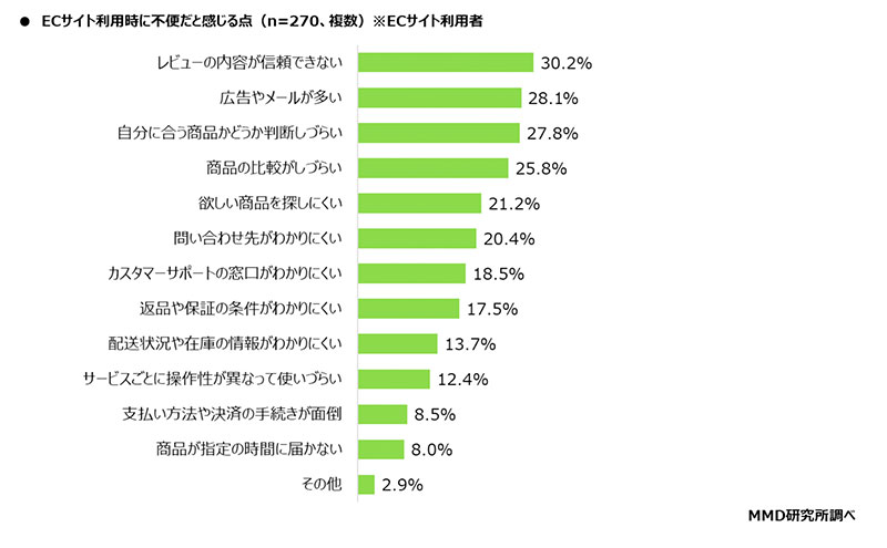 次に、ECサイト利用時に不便だと感じると回答した人を対象に「不便だと感じる点」を質問。「レビューの内容が信頼できない」が30.2%と最も多く、次に「広告やメールが多い」が28.1%、「自分に合う商品かどうか判断しづらい」が27.8%となった。
