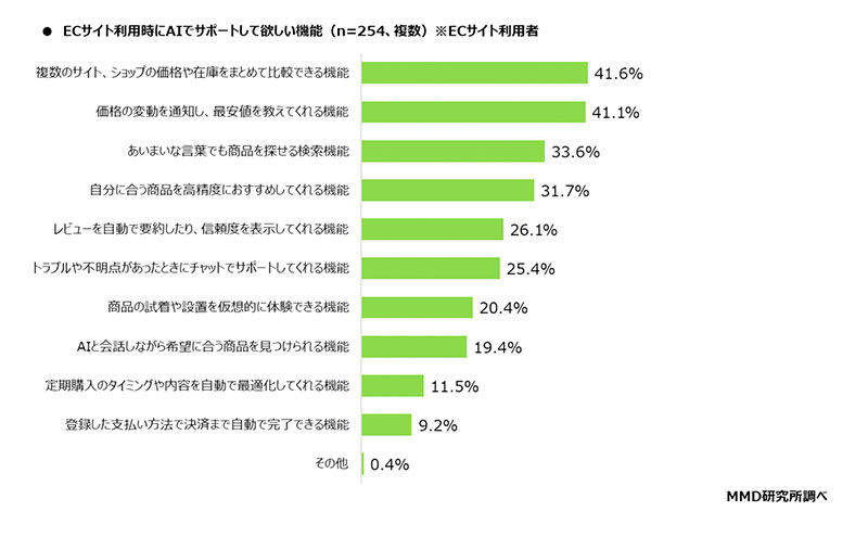 ECサイト利用時に、AIでサポートしてほしい機能については「複数のサイト、ショップの価格や在庫をまとめて比較できる機能」が41.6%と最多だった。