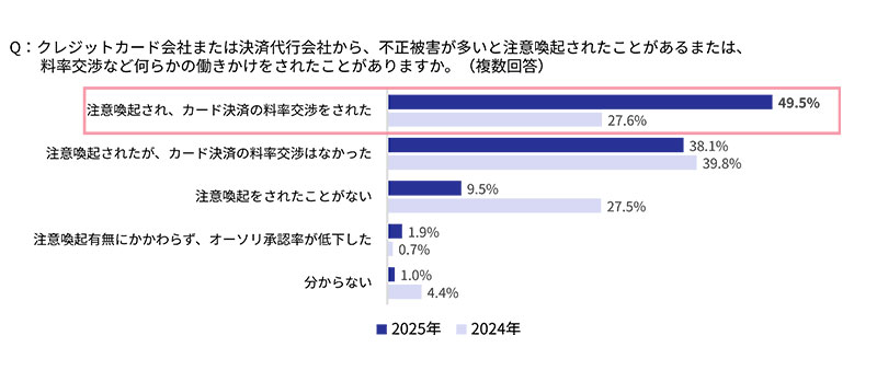 クレジットカードの不正利用被害が多いことを理由に、カード会社から決済手数料の料率交渉を受けた企業は、2024年の27.6%から2025年は49.5%へと大幅に増加。前年比21.9ポイント増となり、EC事業者の約半数が値上げ要請を受ける結果となった。