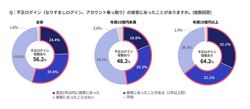 不正ログイン被害の経験率は、2024年の54.8%から2025年は56.2%へと2ポイント増加。年商10億円以上の事業者では64.2%が被害を経験しており、企業規模が大きいほど被害が発生しやすい傾向がみられた。