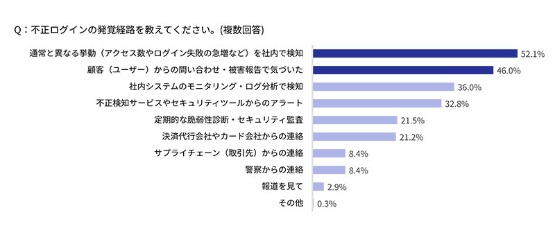 不正ログインの発覚経路として、最も多かったのは「通常と異なる挙動から気づくケース」で52.1%を占めた。
