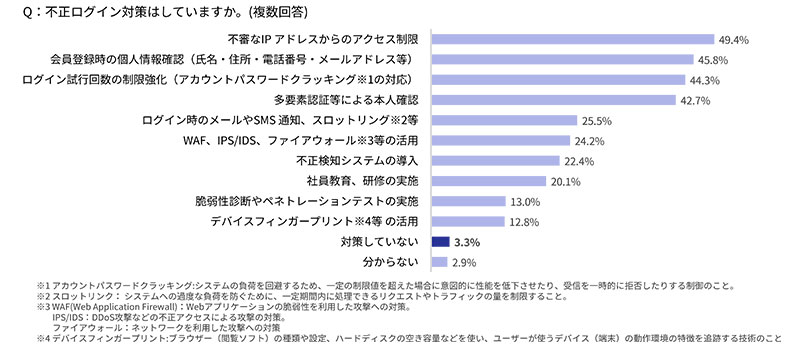 不正ログイン対策を行っていない事業者は3.3%にとどまり、対策が広く浸透している。
