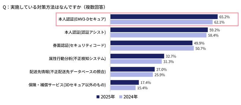 不正注文対策として最も多く採用されているのは、2024年に続き本人認証「EMV3-Dセキュア」となり、2025年も65.2%と最多を維持。一方で、システム開発などの導入コストや負荷を理由に「今後もEMV3-Dセキュアは採用しない」とする事業者も一定数存在し、対策方針が二極化する傾向が見られた。