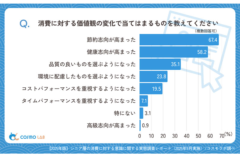 コスモヘルス株式会社(以下、コスモラボ)は2026年1月5日、シニア層の「消費に対する意識」に関するアンケートリサーチの結果を発表した。