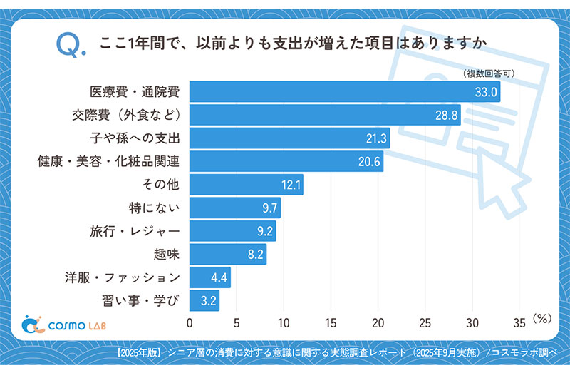 支出が増えた項目として「医療費・通院費」(33.0%)が最多に。次いで「交際費(外食など)」(28.8%)や、「子や孫への支出」(21.3%)、「健康・美容・化粧品関連」(20.6%)が続いた。