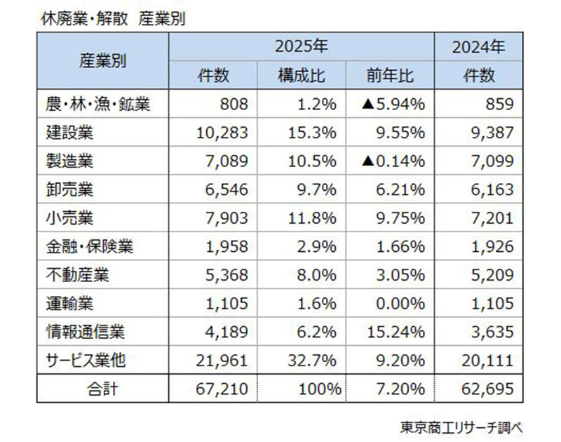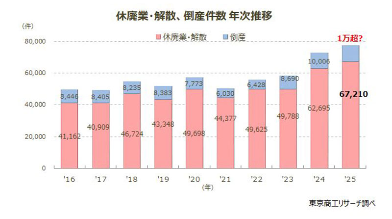 株式会社東京商工リサーチは2026年1月9日、2025年「休廃業・解散企業」動向調査を発表。2025年の「休廃業・解散」企業(以下、休廃業企業)は6万7210件(前年比7.2%増)となった。