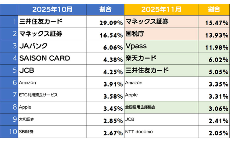 フィッシングサイトブランドランキング11月度は、マネックス証券が1位となった。また、クレジットカード系のブランドも複数ランクインした。