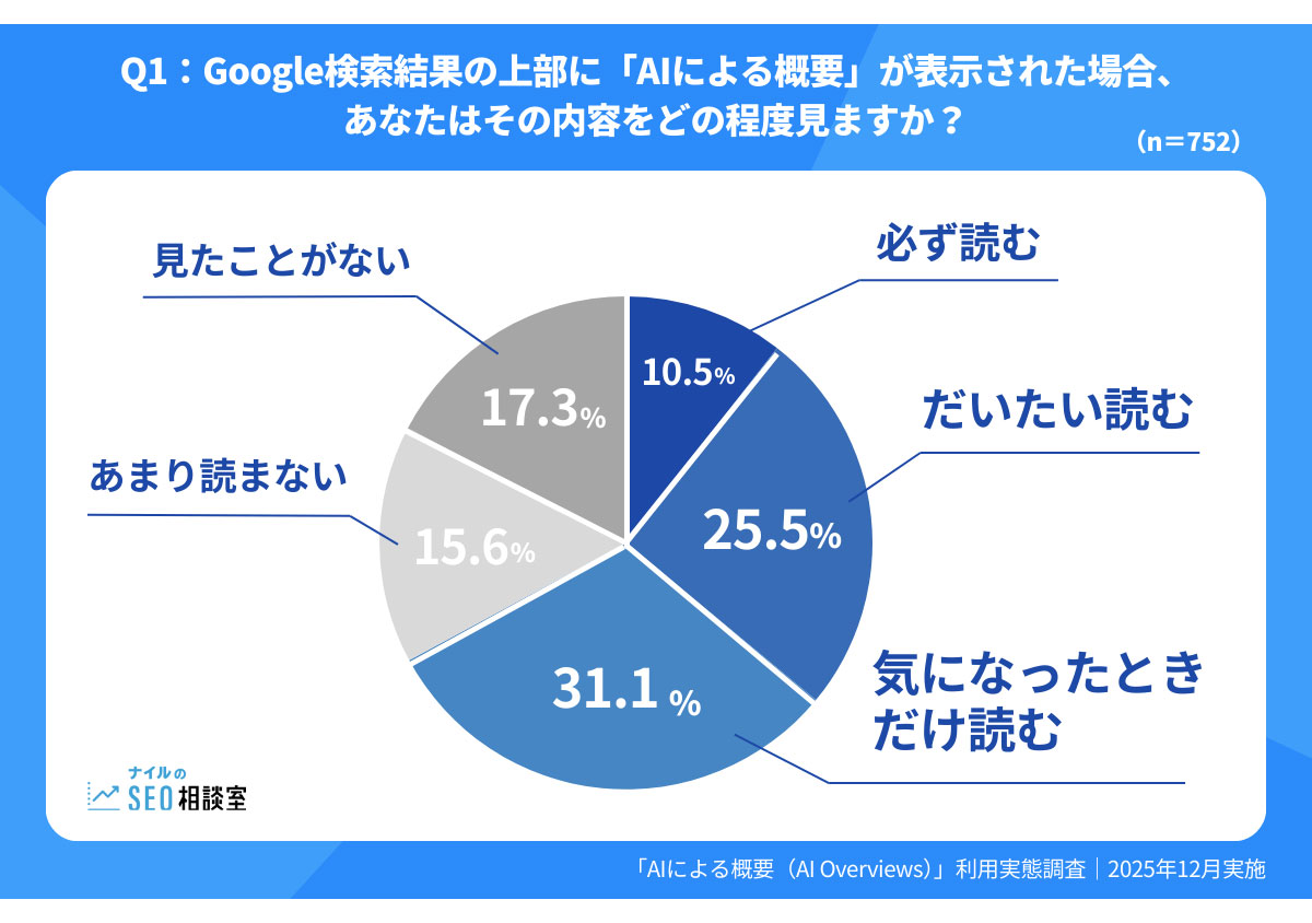 「AIによる概要」を「必ず読む」と回答したのはわずか10.5%にとどまり、最も多かったのは「気になったときだけ読む」(31.1%)となった。