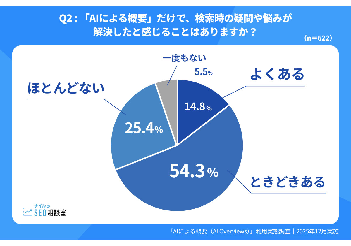 「AIによる概要」だけで検索時の疑問や悩みが解決したと感じる経験について、「よくある」「ときどきある」を合わせると、約7割のユーザーが何らかの解決経験を持つことが分かった。