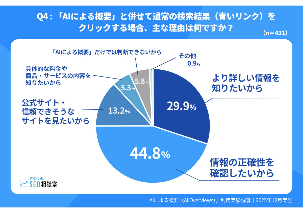その理由は、「情報の正確性を確認したいから」が44.8%で最多に。半数近くのユーザーが、情報の"裏取り"を行っていることが明らかになった。