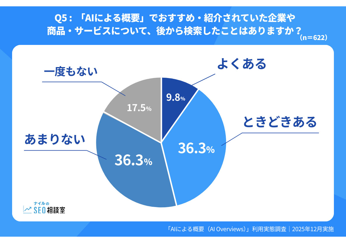 「AIによる概要」でおすすめ・紹介されていた企業や商品、サービスについて、後から指名検索などをした経験があるユーザーは、「よくある」(9.8%)、「ときどきある」(36.3%)を合わせて半数弱を占めた。