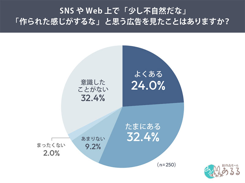 本調査では「SNSやWeb上で『少し不自然だな』『作られた感じがするな』と思う広告を見たことはありますか?」と質問。約5割が何らかの形で「違和感のある広告」に接触していることが明らかとなった。