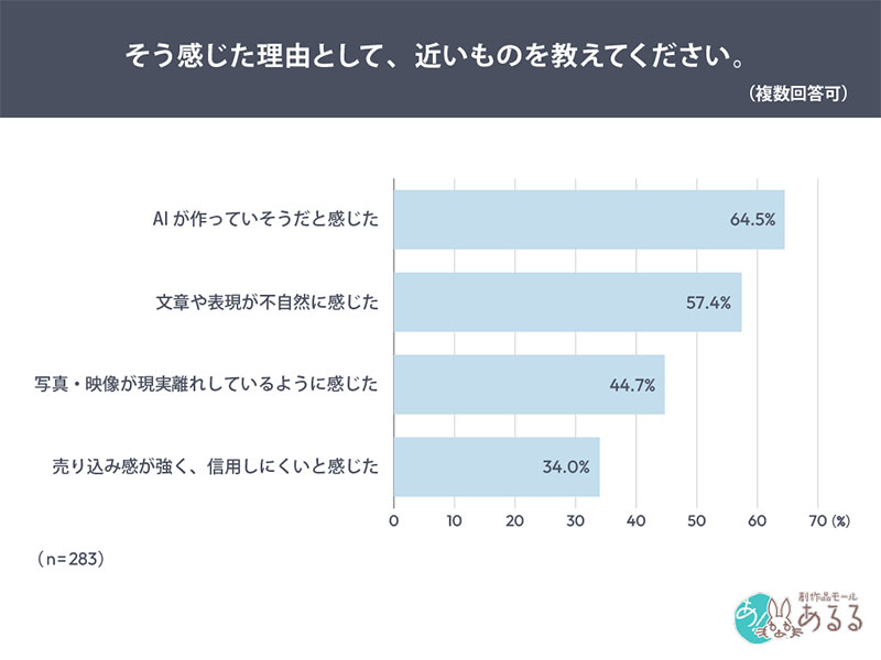 違和感を感じる理由として「AIが作っていそうだと感じた」「文章や表現が不自然に感じた」と回答した人が約6割。AI特有の文章表現やビジュアルへの違和感が、広告に対する違和感の要因になっていることが分かった。