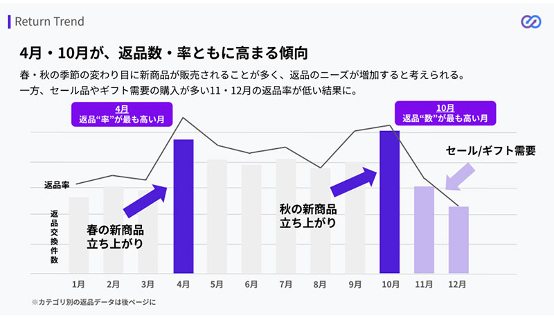 年間データを分析した結果、返品・交換は通年で一定数発生するものの、春・秋の新商品立ち上がり時期(4月・10月)に大きく集中する傾向が確認された。繁忙期を前提とした体制設計を行うことで、顧客満足度を維持しながら次回購入につなげる余地が大きい時期となる。