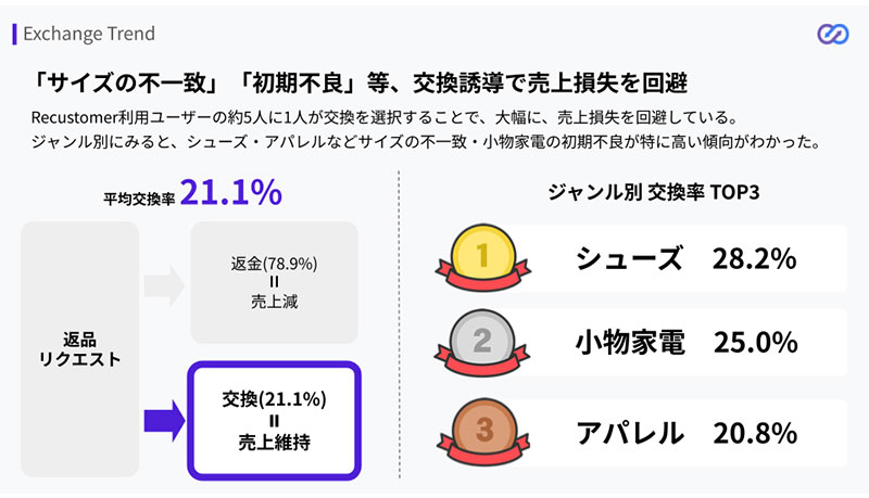 また、返品リクエストが発生した際、約5人に1人のユーザーが返金ではなく「交換」を選択していることが明らかとなった。