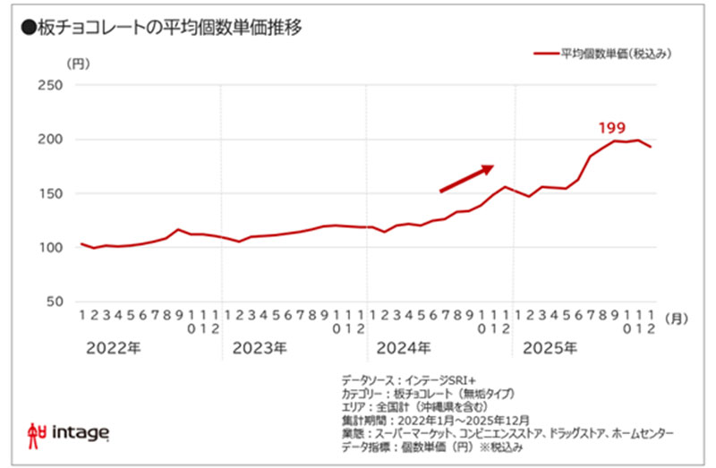 全国約6000店舗の販売実績を継続的に収集している、小売店販売データSRI+®(全国小売店パネル調査)で、板チョコレートの平均個数単価の推移を確認。2022年上半期までは100円前後(税込)で推移していた単価が、その後ゆるやかに上がり始め、2024年以降は急激に上昇。